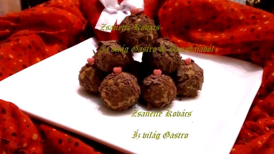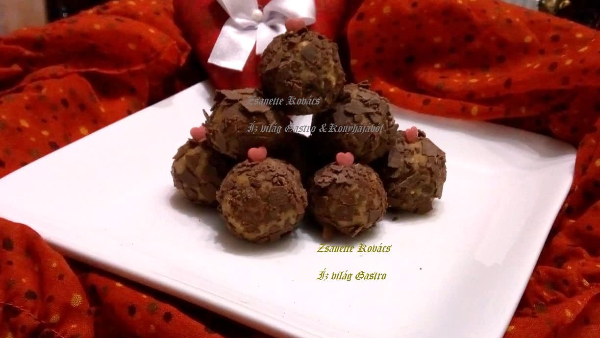 Tálba tesszük a natúr gesztenyét és a csokipehely kivételével leírtakat hozzáadjuk összegyúrjuk és vizes kézzel tetszőleges golyókat formázunk majd csoki pehelybe hempergetjük.